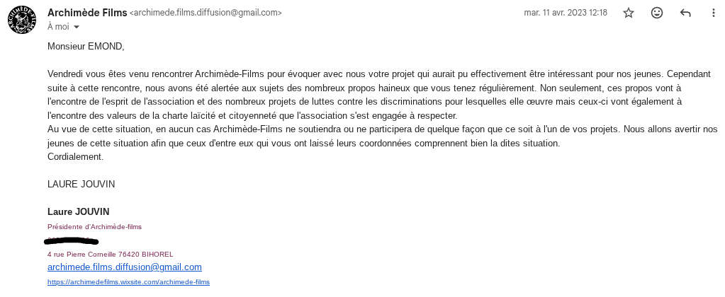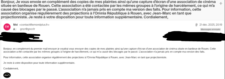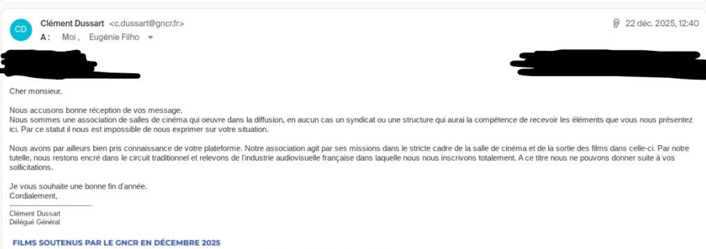 Lorsque j’ai sollicité ce groupement en apportant les preuves du harcèlement que je subissais de la part de membres de leur propre réseau (notamment à l’Omnia Rouen et Archimède Films ( association de cinema basée a rouen), la réponse de leur Délégué Général fut glaciale : « Nous ne sommes pas compétents… Nous restons ancrés dans le circuit traditionnel. » L’analyse est simple : La liberté de création n’est défendue que pour les membres de la « secte ». Pour les indépendants innovants, c’est la porte fermée et le mépris systématique.
