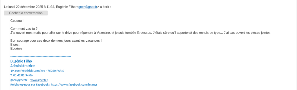 « Par souci de clarté, et afin de garantir la sécurité des victimes ainsi que l’anonymat des témoins, j’ai pris la décision de ne publier que les preuves concernant l’association ainsi que les échanges de mails avec le GNCR. Le reste du dossier est entre les mains de la justice. »