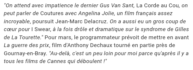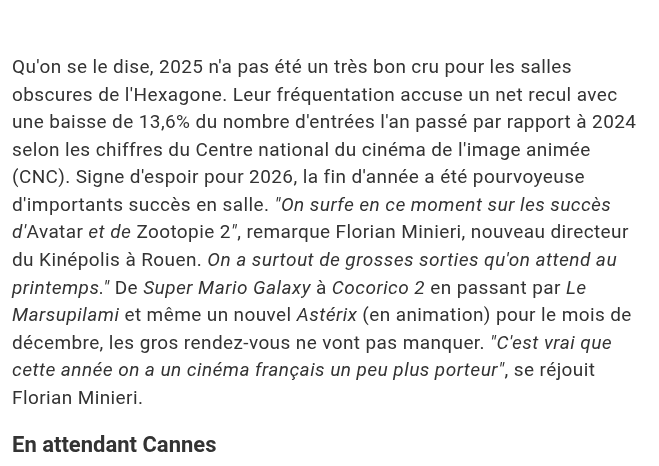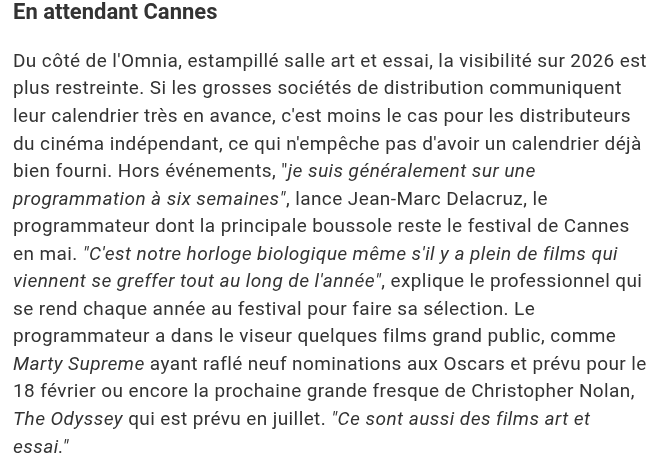 Preuve de l’immobilisme du système : Jean-Marc Delacruz est toujours en poste à l’Omnia République à ce jour. Pour confirmer son influence centrale sur la programmation de la salle, voici l’article de Tendance Ouest (et non Ouest-France) publié le 28 janvier 2026 : https://www.tendanceouest.com/actualite-435854-rouen-cinema-quels-films-attendus-en-2026